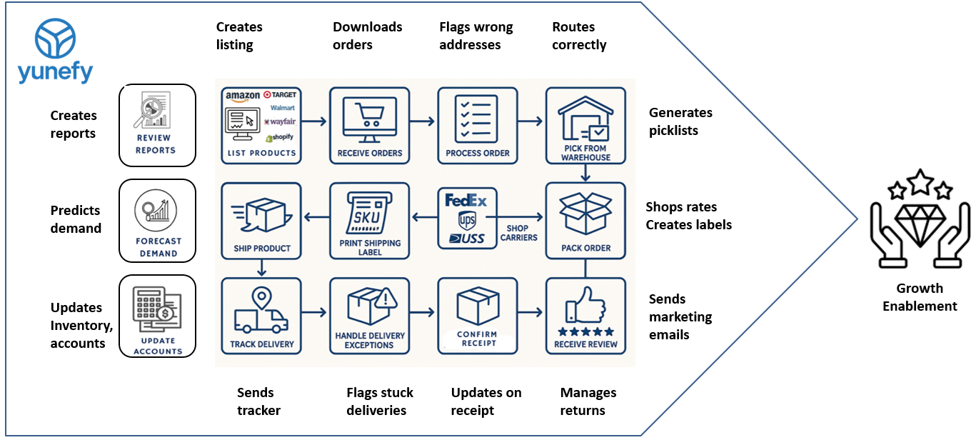 Yunefy works because it replaces handoffs. Orders, inventory, warehouse workflows, shipping, and reporting stay aligned—so you spend less time reconciling and more time scaling.